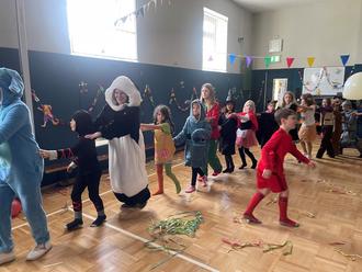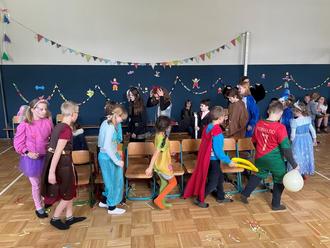 Fastnacht, Fasching, Karneval, wir wollen uns verkleiden – unter diesem Motto dekorierten die Schülerinnen und Schüler der Evangelischen Schraden- Grundschule in Großthiemig am Faschingsdienstag ihre Turnhalle, um nach dem Mittagessen eine kunterbunte Faschingsparty zu feiern. Der hauseigene DJ sorgte mit stimmungsvoller Musik dafür, dass Katzen, Hexen, Prinzessinnen und Fußball Stars ihren Spaß hatten. Traditionelle Tänze und Spiele wie die Polonaise, Laurenzia und der Stuhltanz durften da natürlich nicht fehlen. Versüßt wurde den Kindern die Feier mit Süßigkeiten vom Zampern und leckeren Pfannkuchen vom Fraundorfer Bäcker.