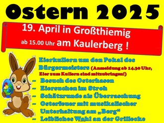 Gegen Abend wird dann wieder das traditionelle Osterfeuer entfacht. Für das leibliche Wohl werden die Großthiemiger Sportler in der Grillecke sorgen. Also unbedingt für Ostersamstag den 19.4.2025 ab 15.45 Uhr diesen Termin reservieren, dass Org.-Team freut sich über ihren Besuch!