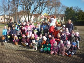 Gleich zu Beginn der Osterferien besuchte uns der Osterhase. Am Denkmalsplatz begegneten wir ihm und brachten dem Osterhasen ein Ständchen mit Osterliedern. Es hatte dem Osterhasen sehr gefallen und gemeinsam gingen wir zur Kita zurück, in der Hoffnung, dass der Osterhase für die Kinder noch etwas versteckt hatte. Und siehe da, auf dem Kindergartenspielplatz haben alle Kinder eine Überraschung gefunden. Ganz lieben Dank Osterhase, dass du an uns gedacht hast und du dir die Zeit genommen hast, uns zu besuchen.