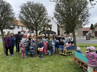 Es ist eine schöne Tradition in Hirschfeld, dass uns jedes Jahr der Osterhase im Kindergarten besucht. Am Donnerstag (10. April) vor den Osterferien versteckte er uns auf dem Gelände des Kindergartens für alle Kinder, Praktikanten und Erwachsenen ein kleines Geschenk. Am Nachmittag durften die Schulkinder aus dem Hort die versteckten Osternester suchen. Mit viel Spaß waren alle Kinder bei der Sache und freuten sich über die kleinen Gaben. Am Freitag (11. April) verabredeten sich die Kinder mit dem Osterhasen am Osterbrunnen, um zu ihn zu schmücken und gemeinsam zu singen. Selbst die Kleinsten hatten ein Lied und Gedicht eingeübt, worüber sich der Osterhase sehr freute.