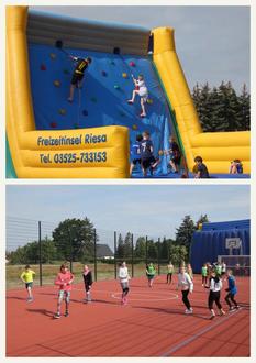 Auch der Spaß kam an diesem Tag nicht zu kurz. Die Freizeitinsel Riesa stellte für unsere Kinder ein Hüpfburg sowie eine Kletterwand auf. Diese Station war bei allen Kindern der 1. - 6. Klasse sehr beliebt.