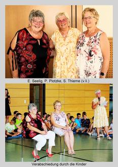 ausscheidende Lehrerinnen ließen in kurzen Worten ihre Tätigkeit noch einmal Revue passieren. Dabei merkte man einigen Beteiligten an, dass es gar nicht so einfach ist, plötzlich loszulassen und einfach Tschüss zu sagen. Obwohl jeder wusste, dass nun dieser Zeitpunkt gekommen war. Alle noch verbleibenden Kolleginnen verabschiedeten sich gemeinsam mit ihrem Geschenk auf sehr lustige Art und Weise. Sabine und Evi, wir rufen euch noch einmal zu: „Wir wünschen euch alles Gute, Gesundheit, macht das Beste aus eurem Ruhestand und denkt daran, es war eine schöne Zeit mit euch zu arbeiten.“