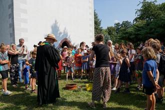 Im Anschluss an den Gottesdienst erfolgte im Kirchgarten noch ein kleines Ritual. Jeder Schüler durfte zu Beginn Dank & Klage auf einem kleinen Zettel notieren und in eine entsprechende Kiste stecken. Diese Kisten standen während des Gottesdienstes auf dem Altar. Unter freiem Himmel verbrannte Pfarrer Heinze dann alle Zettel in einer kleinen Blechdose und segnete die Asche. Symbolisch stiegen nun Dank und Klage der Besucher mit dem Rauch zu Gott auf. Die gesegnete Asche wurde mit Anzuchterde in einem Blumentopf vermischt und Blumensamen darin ausgesät. Die Sprösslinge sollen jetzt wachsen und gedeihen, wie es Kinder in einem achtsamen und liebevollen Umgang tun.