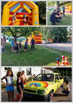 Dem feierlichen Teil in der Kirche folgte abschließend ein kleines Sommerfest auf dem Schulhof. Dank tatkräftiger Unterstützung der Eltern war für das leibliche Wohl bei den sehr sommerlichen Temperaturen gesorgt. Während sich die Erwachsenen mit einem kühlen Getränk und anderen selbst zubereiteten Köstlichkeiten stärkten, vergnügten sich die Kinder auf der vom Autohaus Neustadt Elsterwerda bereitgestellten Hüpfburg, bemalten ein Auto der besonderen Art mit dem Regenbogen der Schule und kühlten sich bei Wasserspielen mit der Feuerwehr Großthiemig ab. Für diese tolle Unterstützung danken die Schüler recht herzlich und verabschieden sich in die freudig erwarteten Ferien.