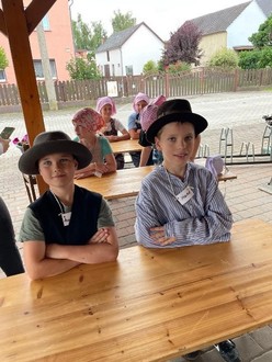 Als wir dann alle verkleidet waren, bekamen wir einen neuen Namen und dann ging es schon los. Wir hatten als erstes Deutsch und haben das „I“ in alter Schrift geschrieben. Nach dem wir mit Deutsch fertig waren, ging es mit Mathe weiter. Frau Lösche gab uns die Aufgabe die 6er und 8er Malfolge aufzuschreiben. Leider war der Vormittag so schnell um und es hieß dann Abschied nehmen.