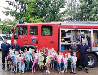 Am Nachmittag feierten die Vorschüler dann mit ihren Familien noch ihr Abschlussfest. „Ade, du schöne Kindergartenzeit“ sangen sie bei ihrem Programm, am 12.07.24 und spätestens bei diesem Lied rollte das ein oder andere Tränchen bei den Eltern. Traditionell mit „tatütata“ brachte die Feuerwehr wieder für die Kinder die Zuckertüten.