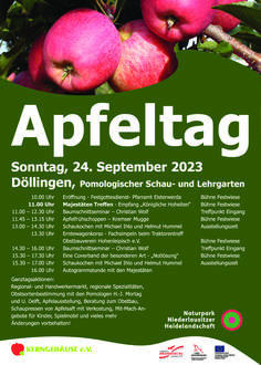 Der Monat September ist der schönste Monat im Kalender des Streuobstjahres. Die Ernte des schmackhaften Kernobstes, wie Äpfel und Birnen, steht nun an. Der Lohn für all die Mühe und Pflege wird eingebracht. Alles, was Sie über das Lieblingsobst wissen wollen, wird an diesem Tag zum Thema gemacht. Neben fachlicher Information und Beratung gibt es jede Menge Köstlichkeiten und Regionale Spezialitäten zu probieren, Kulturprogramm und buntes Markttreiben vereinen Modernes und Althergebrachtes, Musikalisches und Unterhaltsames. Mit einem Festgottesdienst unter freiem Himmel, einer sortenreichen Apfel-ausstellung, Obstsortenbestimmung, Fachberatung, zwei Baumschnittseminaren, einem Erntewagenkorso, Live-Musik und vielem mehr wird es ein gebührendes Fest für die ganze Familie sein.