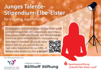„Unser Stipendium rückt das Engagement junger Talente aus Elbe-Elster in die Öffentlichkeit und fördert besondere Projekte zum Wohle unserer Region.“ so Thomas Hettwer vom Vorstand der Sparkassenstiftung. Ermöglicht wird dies durch die gemeinsame Stiftungsinitiative der Apotheker Dr. Liebe Stiftung, der Wolfgang und Regina Böllhoff Stiftung sowie der Sparkassenstiftung „Zukunft Elbe-Elster-Land“.