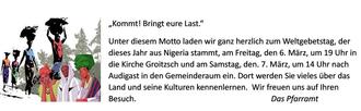 Unter diesem Motto laden wir ganz herzlich zum Weltgebetstag – der dieses Jahr aus Nigeria stammt – am Freitag, den 6. März, um 19 Uhr in die Kirche Groitzsch und am Samstag, den 7. März, um 14 Uhr nach Audigast in den Gemeinderaum ein. Dort werden Sie vieles über das Land und seine Kulturen kennenlernen. Wir freuen uns auf Ihren Besuch.