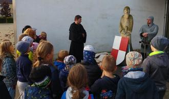 In den Herbstferien ging es mit den Groitzscher Hortkindern noch einmal auf Suche nach dem Schatz von Wiprecht II. von Groitzsch. Wo anders als auf dem Wiprechtsburggelände könnte denn sein Schatz vergraben sein? Das Wetter meinte es aber nicht so gut mit dieser Veranstaltung. So fand sie im Gelände des Wiprechts-Gymnasiums statt. Nach Begrüßung von Ritter Martin und dem Mönch Bruder Dietmar suchten die Hortkinder emsig auf dem Gelände, bis sie schließlich fündig wurden. Zwei Schatztruhen und ein kleines Holzschwert mit „Edelstein“ wurden ausgegraben. Die eine Truhe enthielt Naschwerk, die zweite war gar nicht so leicht zum Öffnen. Darin waren dann „richtige“ Münzen. Da war die Freude groß, weil auch für jeden Schatzsucher eine Münze als Lohn ausgegeben wurde. Ritter Martin schlug dann noch Zwei zum Ritter und stellte sich ihnen zum offenen Kampf.