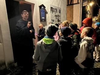 Damit dies aber nicht auf die Kinder am Stadtturm aufmerksam werden konnte, war ein leises Verhalten der aufgeregten Schüler notwendig. Nachdem auch Gruselgeschichten abgelehnt wurden, ging es in dem Turm.