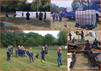 Am nächsten Tag wurden nach dem Frühstück verschiedene Stationen auf und neben dem Gelände besucht und hierbei verschiedene Aufgaben in Teamarbeit auch mit anderen teilnehmenden Jugendfeuerwehrmitgliedern gelöst. Da es recht warm wurde, konnten die Floriansjünger dann auch noch bis zum Festappell das Freibad besuchen. Nach dem Festappell gab es dann auch für alle Veranstaltungsteilnehmer das Abendessen und die Festveranstaltung nahm mit Musik & Tanz sein Ende.