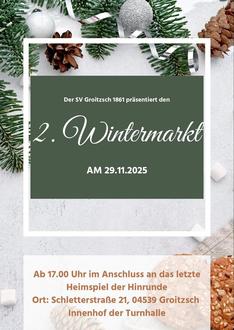 Anschließend richten wir, Eure Fußballer, den zweiten Wintermarkt aus. Wir möchten uns bei allen Fans, Unterstützern, Sponsoren, Angehörigen, Neugierigen und allen Groitzschern bedanken. Es wird allerlei Köstlichkeiten geben, vom Grill, vom Feuer und vieles mehr. Lasst Euch überraschen. Alles für kleines Geld. Mit dieser Feier läuten wir dann die Weihnachtszeit ein und laden alle Groitzscher recht herzlich dazu ein.