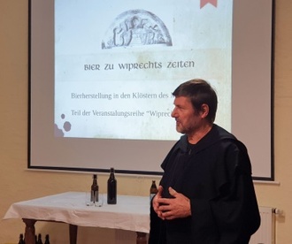 Am 23.11. fand eine weitere Veranstaltung im Rahmen des Projektes Wiprechts Garten statt. Diesmal hatten wir in das Vereinshaus Stadtmühle eingeladen. Der Hobbybrauer Jan Schäfer referierte nicht nur über das Thema „Bier zu Wiprechts Zeiten“, sondern sprach auch über seinen Versuch, zwei Biersorten nach mittelalterlicher Art zu brauen. Eigentlich ist Olaf Günter vom Verein für das Projekt verantwortlich, konnte aber wegen einer Fortbildung leider nicht teilnehmen. So eröffnete der Vorsitzende des Vereins Dietmar Schäfer – dem Thema und der Zeit entsprechend – als Bruder Dietmar die Veranstaltung. Was folgte war ein sehr interessanter Vortrag über die Geschichte der Bierherstellung durch Mönche und Nonnen zur Zeit Wiprecht II. von Groitzsch. Alle Gäste verfolgten gespannt den Informationen von Jan Schäfer. Er verstand es fabelhaft, alle in seinen Bann zu ziehen. Die Gäste erfuhren die Rezeptur, die sich gravierend vom heutigen Bier unterscheidet. Die Biere des frühen Mittelalters wurden neben Hopfen auch mit allerlei Kräutern und Gewürzen aromatisiert.