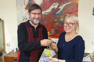Dietmar Schäfer überreicht der Künstlerin Christiane König zur Eröffnung ein kleines Präsent.