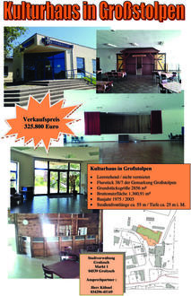 Die Stadt Groitzsch schreibt das Kulturhaus in Großstolpen zum Verkauf aus. Die Grundstücksgröße des Flurstückes 36/13 der Gemarkung Großstolpen beträgt 2.856 m². Bei dem Gebäude handelt es sich um ein 1975 errichtetes und 2003 erneuertes Objekt mit einer nutzbaren Gebäudebruttofläche von 1.360,91 m², welche sich unterteilt in einen Saal, Barbereich, Bühne, Barbarastube, Speiseraum, Foyer, Kegelbahn, Abstellräume und Sanitärräume.