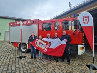Lars Hartung und Sabine Renker überraschten uns. Fahnen mit unseren Wappen übergaben sie den Kameraden der FFW Großstolpen. Diese schmücken nun unsere bis jetzt noch leere Fahnenmasten.