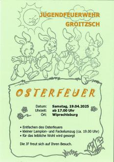 Die Floriansjünger der JF Groitzsch laden am Samstag, den 19.04.2025 ab 17.00 Uhr zum gemütlichen Osterfeuer ein.