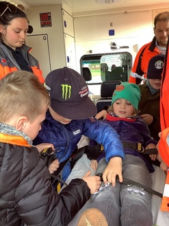 Auf interessante Weise vermittelte Martin den Kindern, wie auch sie schon erste Hilfe leisten können. Großes Interesse wurde natürlich im Rettungswagen geweckt. Den meisten Kindern wurde so auch die Angst genommen, in so einen Wagen einzusteigen. Die ganz Mutigen trauten sich sogar auf die Trage zu legen.