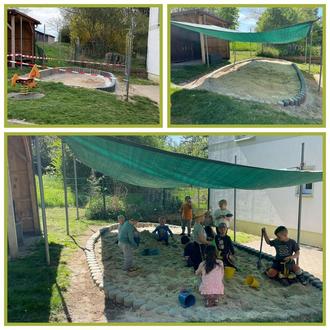 Nach seinem Winterschlaf haben wir Anfang April, mit Hilfe von fleißigen Vatis, begonnen unseren Sandkasten wiederherzurichten. Der Boden wurde ausgehoben und es wurden neue Palisaden gesetzt. Diese sind jetzt höher und so bleibt der Sand auch im Sandkasten. Zu guter Letzt füllten uns die Mitarbeiter vom Bauhof wieder Sand in den Sandkasten. Endlich können wir wieder nach Herzenslust buddeln.