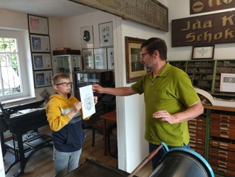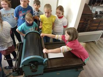 Das Schuljahresende für die vierten Klassen ist auch gleichzeitig das Ende der Grundschule und die Trennung des weiteren Schulweges in die Oberschule und ins Gymnasium. Das Abschlusszeugnis dann in eine besondere Mappe zu legen, wobei diese Mappe noch selbst bedruckt werden sollte, war das Ziel eines Projektes zwischen den vierten Klassen der Grundschule und des Vereins. Die Räumlichkeiten im Museum (Alte Wache) mit der Geschichte zu den Druckereien in Groitzsch, eignet sich für diese museumspädagogische Arbeit. Bevor gedruckt werden konnte, wurde kurz über die Geschichten des Druckens informiert. Nun konnte von den Schülerinnen und Schülern der Druck ihrer Zeugnismappe beginnen. Druckplatte einschwärzen, Mappe auflegen und dann drucken, alles selbst und jedes Ergebnis war ein gutes, denn man hatte es ja selbst gedruckt. Nach drei Tagen (Klassen 4 a, b, c) war die „Arbeit“ geschafft und die Zeugnismappe mit unseren Groitzscher Stadtwappen „verziert“.