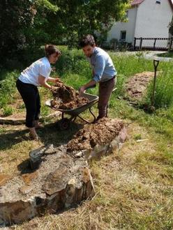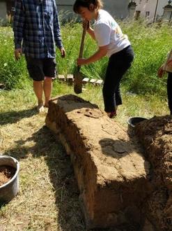 Stattdessen bauten wir mit dem erfahrenen Lehmbau(lehr)er und Heimatforscher draußen bei schönstem Sonnenschein eine Sitzbank und Insekten-Wand in der regional typischen, historischen Wellerlehmbauweise in unseren gerade entstehenden öffentlichen Heilkräutergarten.