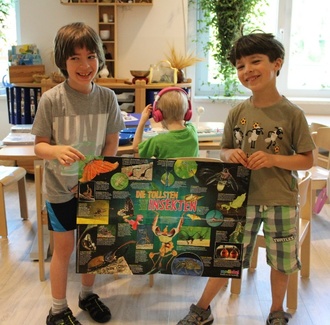 Wir legten ein Regenwurmbeobachtungsglas mit Erde und farbigem Sand an, fanden Schnecken, welche gerade Eier gelegt hatten und beobachten sie in einer speziellen Insektentasche, entdeckten Bienen und Hummeln bei der Nektarsuche, bauten im Garten kleine Wohnungen für Marienkäfer, gestalteten wunderbare Bilder, forschten mit Fred der Ameise, verglichen „Groß“ und „Klein“ mit der Lupe, überlegten, ob der Tausendfüßler wirklich tausend Beine hat und warum sich Marienkäfer manchmal tot stellen.
