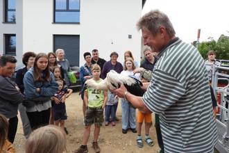 Andreas Fischer zeigt den Zuschauern einen der Groitzscher Jungstörche. Foto: Uwe Seidel