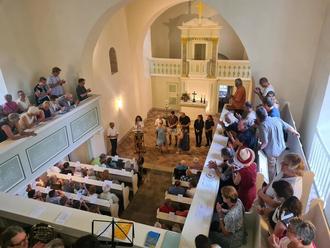 Es folgten vier Jahre der Planung, Fördermittelakquise, restauratorische Untersuchungen, Spendenaktionen und schließlich ab Herbst 2023 über eineinhalb Jahre Umsetzung. Viele Gewerke und Ehrenamtliche haben die Kirche gemeinsam verwandelt; aus dunklem Grau in Grau wurden strahlende Grüntöne mit goldenen Details, umgeben von warmem Weiß – eine in der Kirche freigelegte klassizistische Farbfassung. Auch die im Originalzustand erhaltene Orgel aus dem Jahr 1791 wurde umfassend restauriert. Neu hinzu kamen eine Toilette und eine kleine Teeküche, außerdem wurden die Kirchenbänke im hinteren Bereich mobil gemacht, sodass dort auch stattdessen Tische Platz finden können – oder auch mal eine Tischtennisplatte… Das Kirchgebäude öffnet sich für öffentliche und gemeinschaftliche Nutzungen über die Gottesdienste hinaus und stärkt so seine Rolle als wichtigster Ort der Zusammenkunft im Dorf.