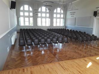 Die Aula der Oberschule wurde ebenfalls in den Ferien saniert und modernisiert mit Maler-, Parkett-, Akustik- und Elektroarbeiten im Wert von fast 70.000 Euro.