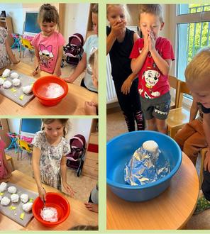 Bereits im August startete unser lang ersehntes Projekt über die Dinosaurier. Zuallererst beschäftigen wir uns mit den verschiedenen Arten und lernten dabei, dass alle Dinos von einem Ursaurier abstammten. Wir gestalteten Dinos selbst, ließen Dinos aus Natroneiern schlüpfen und sprachen über die Ursachen des Aussterbens der Dinos. Weiterhin übten wir ein Dinogedicht und einen Sauriertanz ein. Zum Abschluss des Projektes folgte noch das Vulkanexperiment, bei den wir aus dem Staunen gar nicht mehr herauskamen.