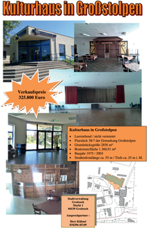 Die Stadt Groitzsch schreibt das Kulturhaus in Großstolpen zum Verkauf aus. Die Grundstücksgröße des Flurstückes 36/13 der Gemarkung Großstolpen beträgt 2.856 m². Bei dem Gebäude handelt es sich um ein 1975 errichtetes und 2003 erneuertes Objekt mit einer nutzbaren Gebäudebruttofläche von 1.360,91 m², welche sich unterteilt in einen Saal, Barbereich, Bühne, Barbarastube, Speiseraum, Foyer, Kegelbahn, Abstellräume und Sanitärräume.