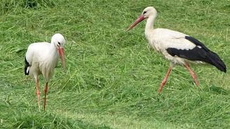 Die Groitzscher Altstörche bei der Futtersuche in den Schnauderwiesen.