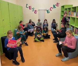 Mit farbigen Sitzelementen und farbenfrohen Bücherregalen bietet dieser Bereich einen einladenden Rückzugsort, an dem die Kinder in Geschichten versinken und ihre Lesefreude entfalten können. Ob in langen Pausen oder nach dem Unterricht – hier darf geschmökert, still gelesen oder gelauscht werden.