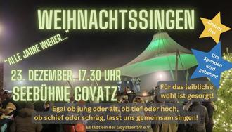 Der Goyatzer Sportverein e.V. lädt herzlich am 23. Dezember ab 17.30 Uhr zum Weihnachtssingen an der Seebühne Goyatz ein. Sie können sich auf eine festliche Atmosphäre und besinnliche Weihnachtslieder mit Blasmusik ab 18 Uhr freuen. Der Eintritt ist frei, jedoch wird um Spenden gebeten. Für das leibliche Wohl ist gesorgt. Kommen Sie vorbei und genießen Sie einen stimmungsvollen Abend mit Familie und Freunden!