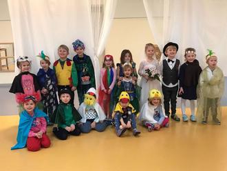 Die Vogelhochzeit ist ein fester Traditionsbrauch in unserer Kita geworden. Über Jahrzehnte hinaus verkleiden sich die Kinder als Vögel und feiern mit einem Tanz und einem gemeinsamen Essen die Hochzeit. In unserem Vogelhaus vor der Kita legen die Vögel Süßigkeiten hinein. Als Dank dafür, dass die Kinder sie gefüttert haben. Sie geben den Kindern etwas von ihrem Hochzeitsschmaus ab. Das Publikum war sehr gerührt. Wie bei einer richtigen Hochzeit gaben sich die Braut (Leonie) und der Bräutigam (Emil) einen Kuss. Alle Zuschauer erhielten einen selbstgebastelten Meisenknödel, von ihren Kindern, als Geschenk überreicht.