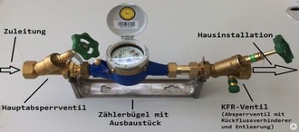 Der Zählerbügel und das KFR-Ventil gehören zur Hausinstallation des Kunden und sind daher beim Fehlen nachzurüsten oder bei Defekten zu erneuern. Nur der Wasserzähler ist Eigentum des Wasserversorgers und somit enden die Aufgabe und Pflichten am Hauptabsperrventil.