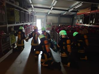Im Praxisteil musste man unter reellen Bedingungen, mit einer Atemluftflasche (300 bar), die Sportgeräte, die Kriechstrecke, den Hitzeraum sowie den Abzugsraum absolvieren.