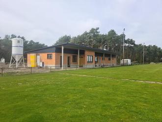 Im Dezember des vergangenen Jahres wurde die Bodenplatte gegossen. Im vergangenen halben Jahr nahm das Gebäude Form an. Ein überdachter Bereich unmittelbar an der Seitenlinie. Hier wird eine kleine Tribüne mit Sitzschalen entstehen, die auch bei regnerischem Wetter den Fans einen gemütlichen Platz bietet. Durch ein Kioskfenster wird die Versorgung auf kurzem Wege sichergestellt. Im Inneren des Vereinsgebäudes befinden sich Umkleidekabinen, die bei Bedarf geteilt werden können, um beispielsweise den eng getakteten Juniorenspielen an einem Spieltag Rechnung zu tragen. Anliegend sind Nasszellen. Herren-, Damen- und barrierefreie WCs liegen zentral im Gebäude und sind somit für Aktive, Gäste und Fans gleichermaßen nutzbar. In Größe und Ausstattung trägt das Gebäude dem aktuellen Vereinsleben Rechnung. Die überschaubare Küche, die sich unmittelbar am Ausschankfenster befindet, ist mittels einer Durchreiche mit dem angrenzenden Vereinsraum verbunden. Dieser soll zukünftig als Ort für Mannschaftsabende, Versammlungen und auch der breiten Öffentlichkeit bei Bedarf zum Beispiel für Feiern zur Verfügung stehen. Für die Unterbringung von Technik zur Pflege der Anlage sowie Trainingsutensilien gibt es ebenfalls Räumlichkeiten.