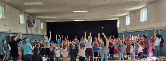 In der Turnhalle, die zur Konzertbühne umgestaltet wurde, bekamen die Kita Kids einen ersten Einblick in die Besonderheiten des Lernens an dieser Schule. Die Drittklässler zeigten, was sie bisher im Musikunterricht des Programms „Klasse: Musik“ gelernt haben. Dabei legten sie großen Wert darauf, die Kita Kids mitmachen zulassen. Es wurde zu Trommelrhythmen und Melodiespielen auf Gitarren fleißig mitgeklatscht. Das war so interessant, dass einige Kids am liebsten gleich ein Instrument spielen wollten. Bei einem Mitmachtanz - dem Mambo Jambo - gab es ganz viel Spaß und Bewegung.