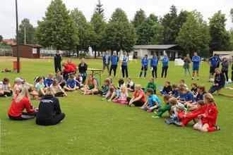„Nicht ohne meine Mädels“ – das war das Motto beim diesjährigen Tag des Mädchenfußballs, der am 17. Juni auf dem Lubolzer Sportplatz stattfand. Dazu eingeladen hatten der SV Blau-Weiß Lubolz 1930 e. V. und der FSV Groß Leuthen/Gröditsch 1990 e. V. Etwa 40 fußballinteressierte Mädchen zwischen 5 und 16 Jahren waren dem Aufruf gefolgt und durften sich auf interessante Stunden zum Thema Fußball freuen. Bevor es an’s runde Leder ging, wurde sich erstmal erwärmt – dies übernahm Nancy Janck von Spree Vita Lübben auf hervorragende Weise. Danach wurde sich dem Fußball gewidmet. Die Mädchen durchliefen fünf Stationen und konnten dabei das DFB-Fußballabzeichen in Gold, Silber oder Bronze erreichen. Die Stationen umfassten Dribbling, Kurzpass-Spiel, Kopfbälle, Flanken und Elfmeterschießen. Nach Absolvieren aller Stationen gab es die Auswertung und jedes Mädchen bekam ihr DFB-Abzeichen. Der zweite Teil des Tages bestand aus den neuen Spielformen im Kinderfußball. Auf mehreren Feldern wurde gleichzeitig Fußball-2, Fußball-3 oder Fußball-5 gespielt. Dies führte zu vielen Ballkontakten, kurzen Spielzeiten, Koordination und vor allem vielen Toren. Das Durchhaltevermögen in mehreren Spielen wurde mit einer Medaille für jede Teilnehmerin belohnt. An den Stationen sowie bei den Spielformen wurden die Mädchen von den Spielerinnen der Frauenmannschaften aus Lubolz und Groß Leuthen/Gröditsch begleitet sowie unterstützt. In einer Pause zum Durchatmen wurde Mylene Hetzke von FC Energie Cottbus begrüßt, die aus Ihrem bisherigen Fußballerleben erzählte und den Mädchen für Fragen und Fotos zur Verfügung stand. Des Weiteren gab es einen Spiel-und-Spaß-Bereich, in dem Anstecker gebastelt, gemalt oder Fingernägel lackiert werden konnten. Gelungen umrandet wurde dieser erlebnisreiche Tag mit guter Musik von Sebastian Tippel sowie fotografisch durch Robert Bier bestens in Szene gesetzt.