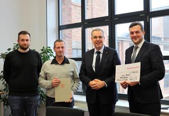 Die Zuwendungsbescheide nahmen Sven Rogosky (2 v. l.), Fachbereichsleiter für Bau- und Instandhaltungsmanagement der Stadt Guben, Geschäftsführer der Gubener Wohnungsgesellschaft Dr. Martin Reiher (r.) sowie Max Schumann (l.) aus dem Bereich Stadtplanung entgegen. © Stadt Guben/LB