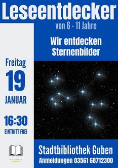 Am 19. Januar 2024 um 16:30 Uhr starten wir mit dem Thema "Wir entdecken Sternenbilder". Dieses kostenlose Angebot richtet sich an Schüler im Alter von 6 bis 11 Jahren. Wir hoffen, euch bei den Leseentdeckern begrüßen zu dürfen!