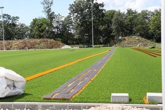 Der Kunstrasen wird verlegt, zugeschnitten und die Nähte verbunden. Anschließend werden zwei Drittel mit Quarzsand aufgefüllt und die Fasern aufgestellt. Der große Vorteil von Kunstrasen, er ist wasserdurchlässig, dadurch soll das Spielfeld auch in nassen Winterwochen bespielt werden können. Parallel werden Arbeiten für den Neubau der Tribünenanlage sowie der Parkplätze und die Außenanlagengestaltung realisiert. Die Baumaßnahme soll Ende 2023 abgeschlossen sein.