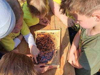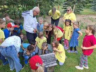 Um den 25 Kindern aus der 1. und 2. Klasse das Leben der fleißigen Bienen noch näher zu bringen, gingen sie am 24. Mai 2024 auf einen ganz besonderen Wandertag. In der Kuckkucksaue im Ortsteil Kaltenborn gibt es eine Schauimkerei. Bei Familie Gräber konnten die Kinder während ihres Besuches viele interessante Dinge über die Bienen lehren. Sie konnten im Erlebnisgarten und auf der Bienenweide ein Picknick veranstalten, sich die Bienenwaben aus nächster Nähe (mit Schutzkleidung) anschauen und natürlich Honig verkosten. In dem kleinen Bauernmuseum auf dem Hof bestaunten die Kinder auch die traditionellen Arbeitsgeräte der Landwirtschaft.