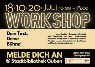 Dein Text, Deine Bühne! Wenn Worte viral gehen und aus Sprache Musik wird, dann ist Poetry-Slam. Von Beatbox-Techniken über Wortspiel bis Theaterspiel wird im U20-Workshop die nächste Generation von Autoren trainiert. Der international bekannte Poetry-Slam-Künstler Bas Böttcher bietet eine 3-tägige Ferienwerkstatt. - Als Gäste werden Comic-Zeichner, Beatboxer und Theaterkünstler dabei sein. Wer sich für Musiktext, Theater oder einen eigenen Youtube-Blog interessiert, ist im Poetry-Slam-Workshop bestens aufgehoben. Neue Teilnehmende und Quereinsteiger sind herzlich willkommen, Vorkenntnisse sind nicht nötig! Es können auch nur einzelne Tage belegt werden.