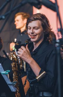Spielfreude pur! Marc Rentsch am Baritonsaxophon.