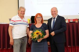 Klaus Schneider und Bürgermeister Fred Mahro beglückwünschten die erneut gewählte Vorsitzende Berit Kreisig. © Stadt Guben, Lehmann