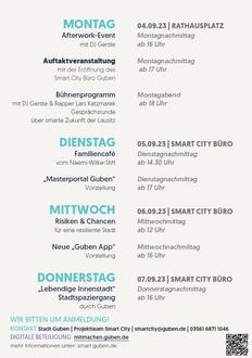 Oskar Starick: „Die Innovationswoche ist, wie der Name schon sagt, eine Woche voller Innovationen. Vom 4. bis 8. September findet jeden Tag mindestens eine Veranstaltung statt, bei der die Bürgerschaft das Smart City Projekt und die Menschen dahinter genauer kennenlernen und vor allem eines: sich beteiligen kann. Auftakt hierfür wird unsere Eröffnungsfeier am 4. September 2023 sein. Von 16 bis 20 Uhr präsentieren sich Gubener und Lausitzer Institutionen auf dem Friedrich-Wilke-Platz und stellen ihre digitalen und partizipativen Projekte vor. Dazu legt DJ Gerste auf, es gibt eine Podiumsdiskussion zur Zukunft der Lausitz und der Rapper Lars Katzmarek tritt auf. Für Kinder gibt es eine Hüpfburg und Kinderschminken – beides ist kostenlos. Außerdem gibt es ein kulinarisches Angebot. Der Eintritt ist frei.“