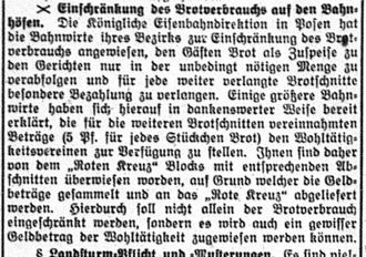 Einschränkung des Brotverbrauchs auf den Bahnhöfen. Die königliche Eisenbahndirektion in Posen hat die Bahnwirte ihres Bezirks zur Einschränkung des Brotverbrauchs angewiesen, den Gästen Brot als Zuspeise zu den Gerichten nur in der unbedingt nötigen Menge zu verabfolgen und für jede weiter verlangte Brotschnitte besondere Bezahlung zu verlangen. Einige grö0ere Bahnwirte haben sich hierauf dankenswerter Weise bereit erklärt, bis für die weiteren Brotschnitten vereinnahmten Beträge (5Pf, für jedes Stückchen Brot) den Wohltätigkeitsvereinen zur Verfügung zu stellen. Ihnen sind daher von dem „Roten Kreuz“ Blocks mit entsprechenden Abschnitten überwiesen worden, auf Grund welcher die Geldbeträge gesammelt und an das „Rote Kreuz“ abgeliefert werden. Hierdurch soll nicht allein der Brotverbrauch eingeschränkt werden, sondern es wird auch ein gewisser Geldbetrag der Wohltätigkeit zugewiesen werden können.
